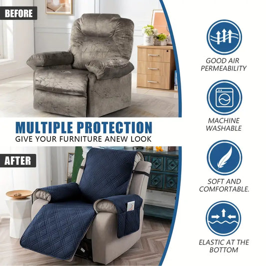 1pc Quilted Recliner Chair Cover With Pockets - Navy Blue