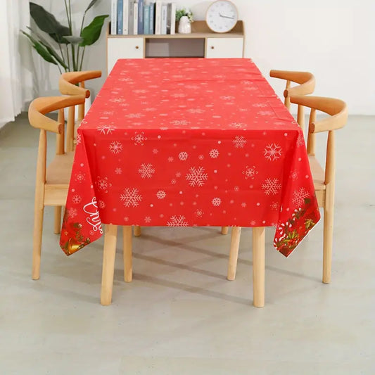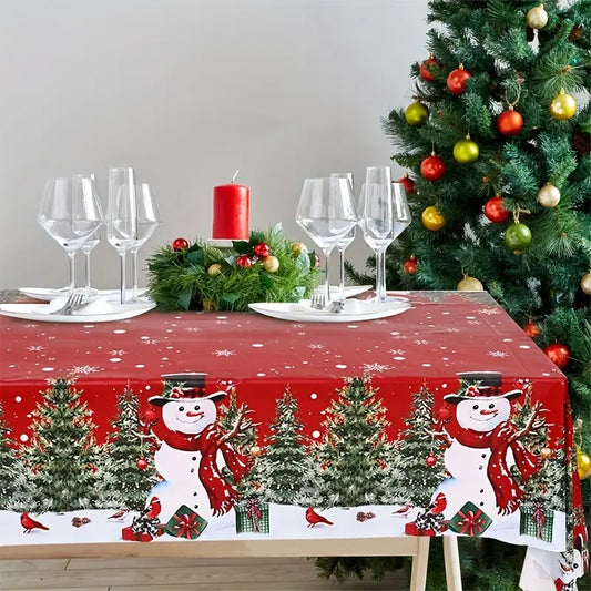 Merry Christmas Red Tablecloth - Disposable Plastic with Snowman & Tree Design, Perfect for Holiday Decorations