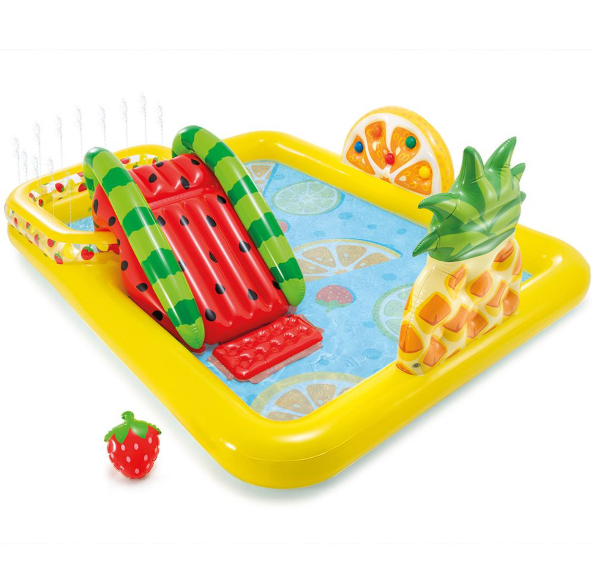 - Inflatable kiddie pool features a slide, sprinklers, and inflatable fruit toys.